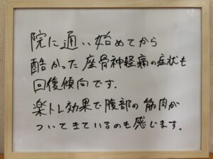 痛みやしびれを繰り返さない為に、インナーマッスルの強化する為のストレッチやケア方法もお伝えし、坐骨神経の悩みだけを対処するのではなく、身体全体を健康に保てるようお手伝いします。